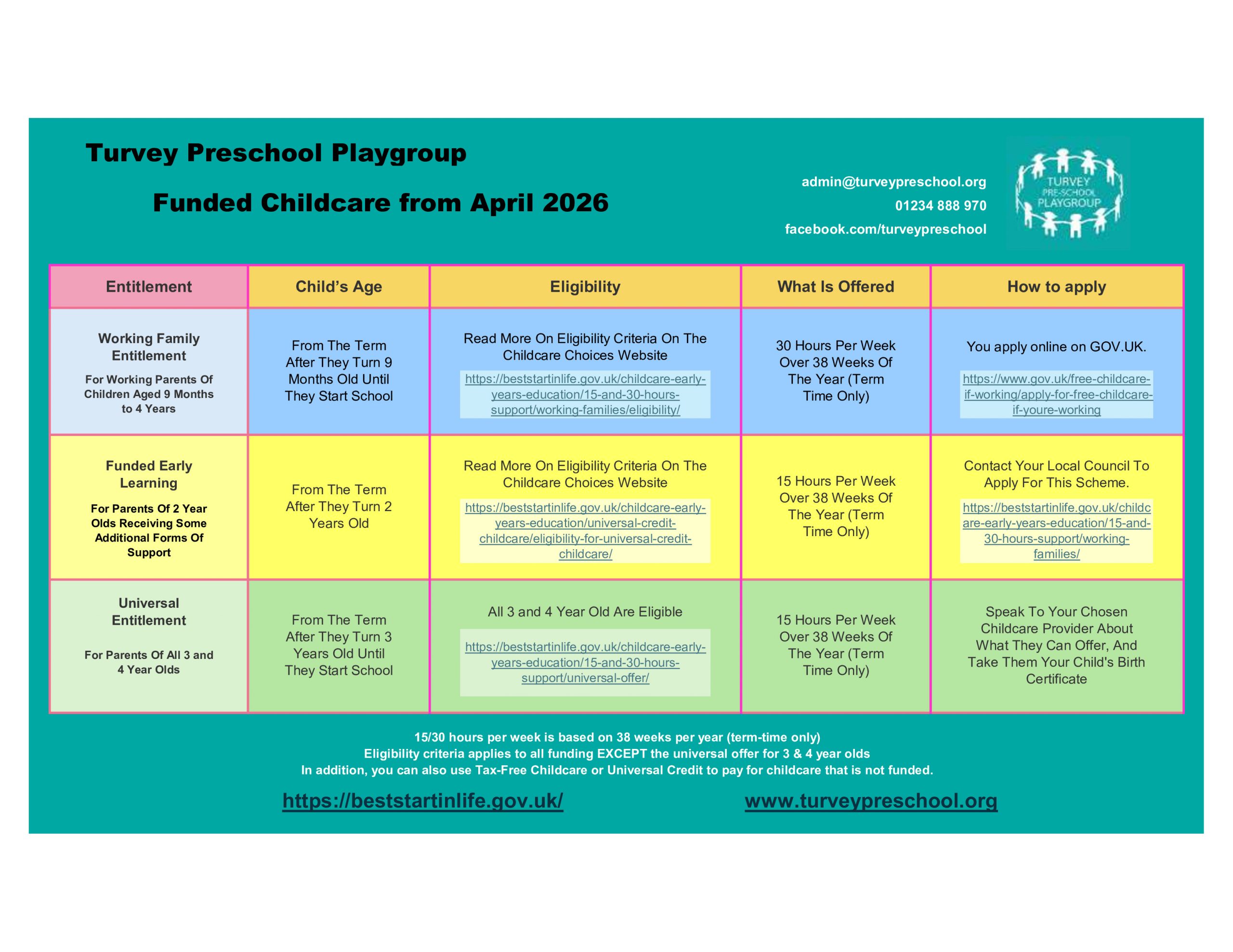 For further information and to check your eligibility please look here: https://www.childcarechoices.gov.uk We also accept spaces for funded 2 year olds. There is eligibility criteria to claim 15 hours funded space.